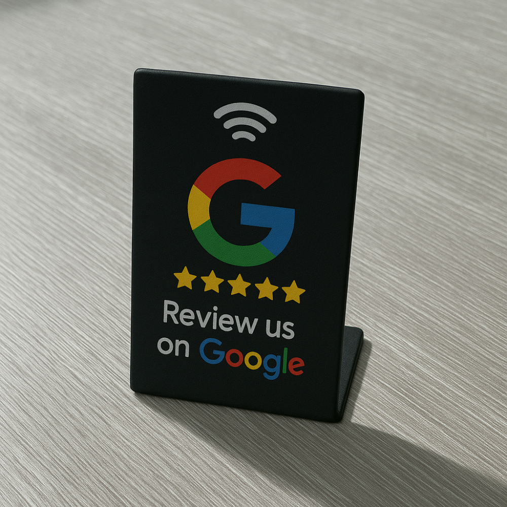 ستاند أنيق يحتوي على شريحة NFC مبرمجة مسبقًا برابط صفحة التقييم الخاصة بك على Google Maps.