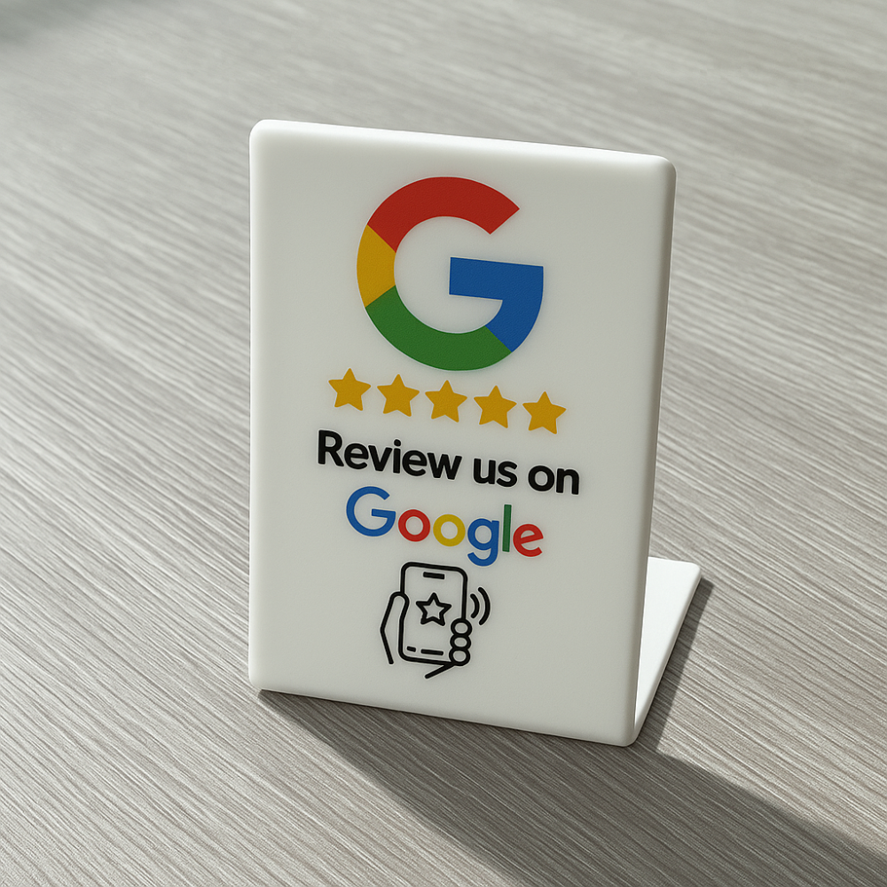 شجّع عملاءك على تقييمك عبر Google بسهولة! ستاند أنيق يوضع على الطاولة ويُظهر احترافيتك ويزيد ثقة العملاء.